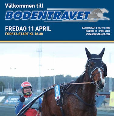 Nästa tävlingsdag på Bodentravet är fredag 11 april. Travrestaurangen dukr upp en mäktig buffé och det är fri enté och parkering. Första start 18:30